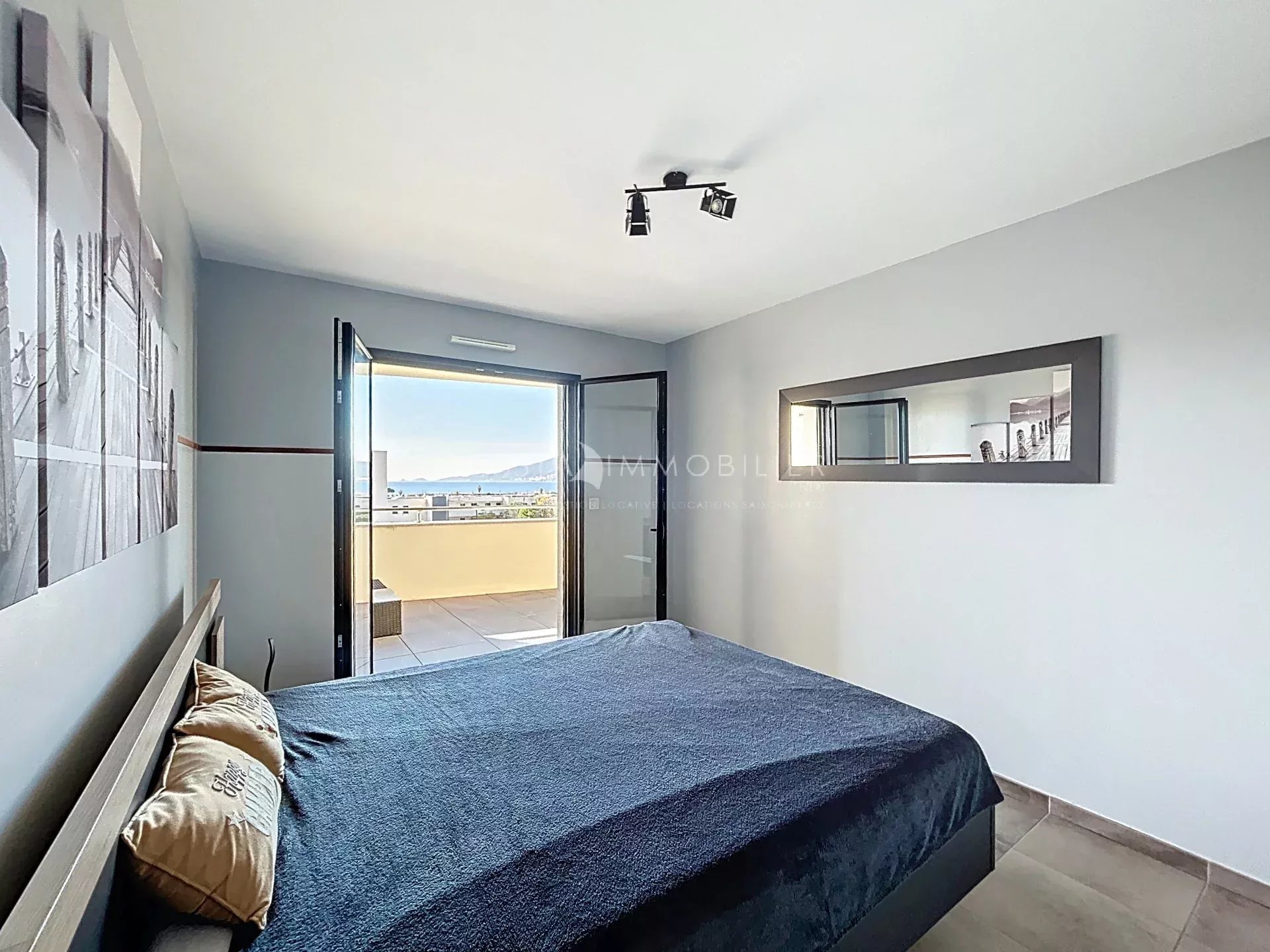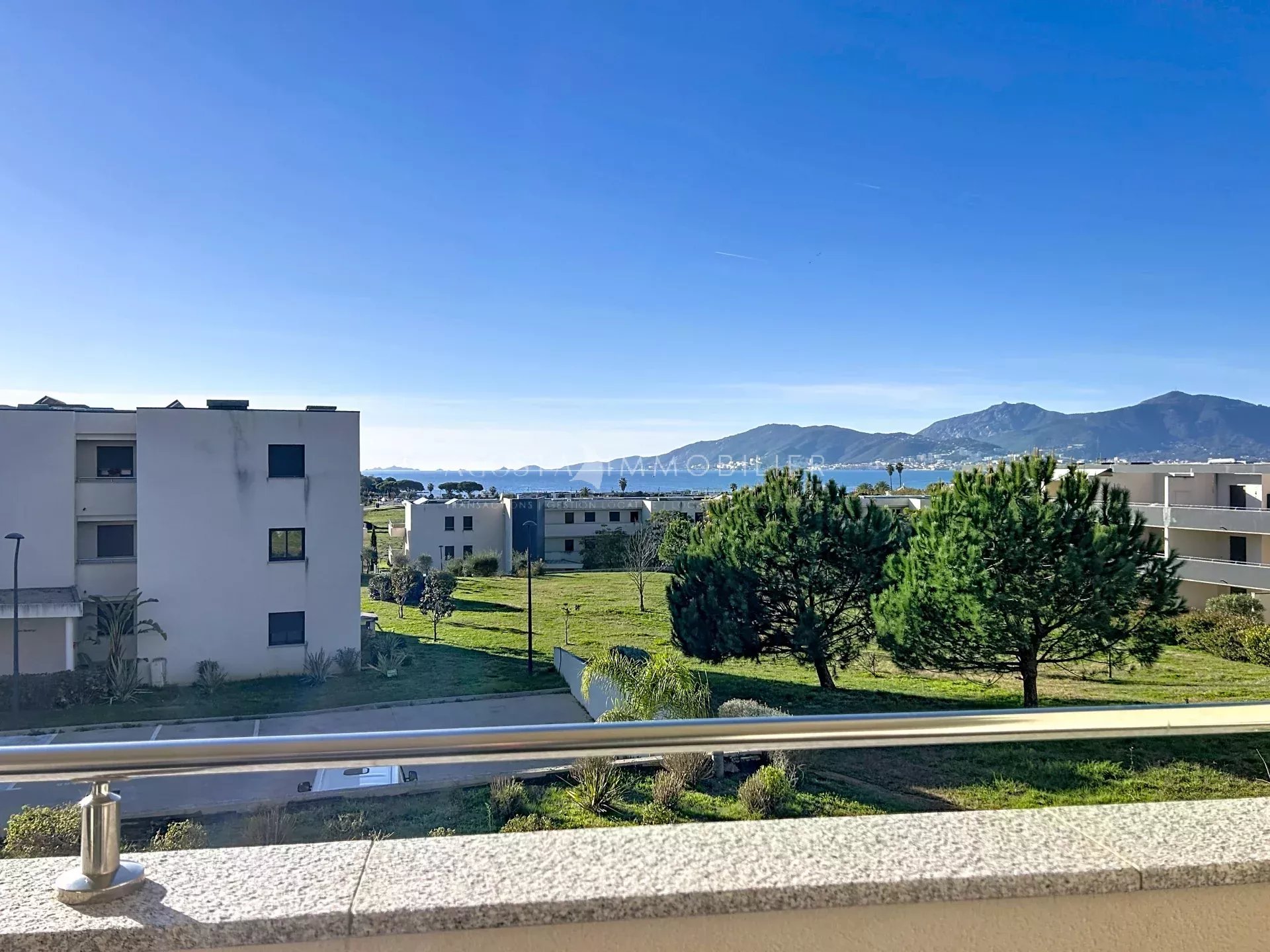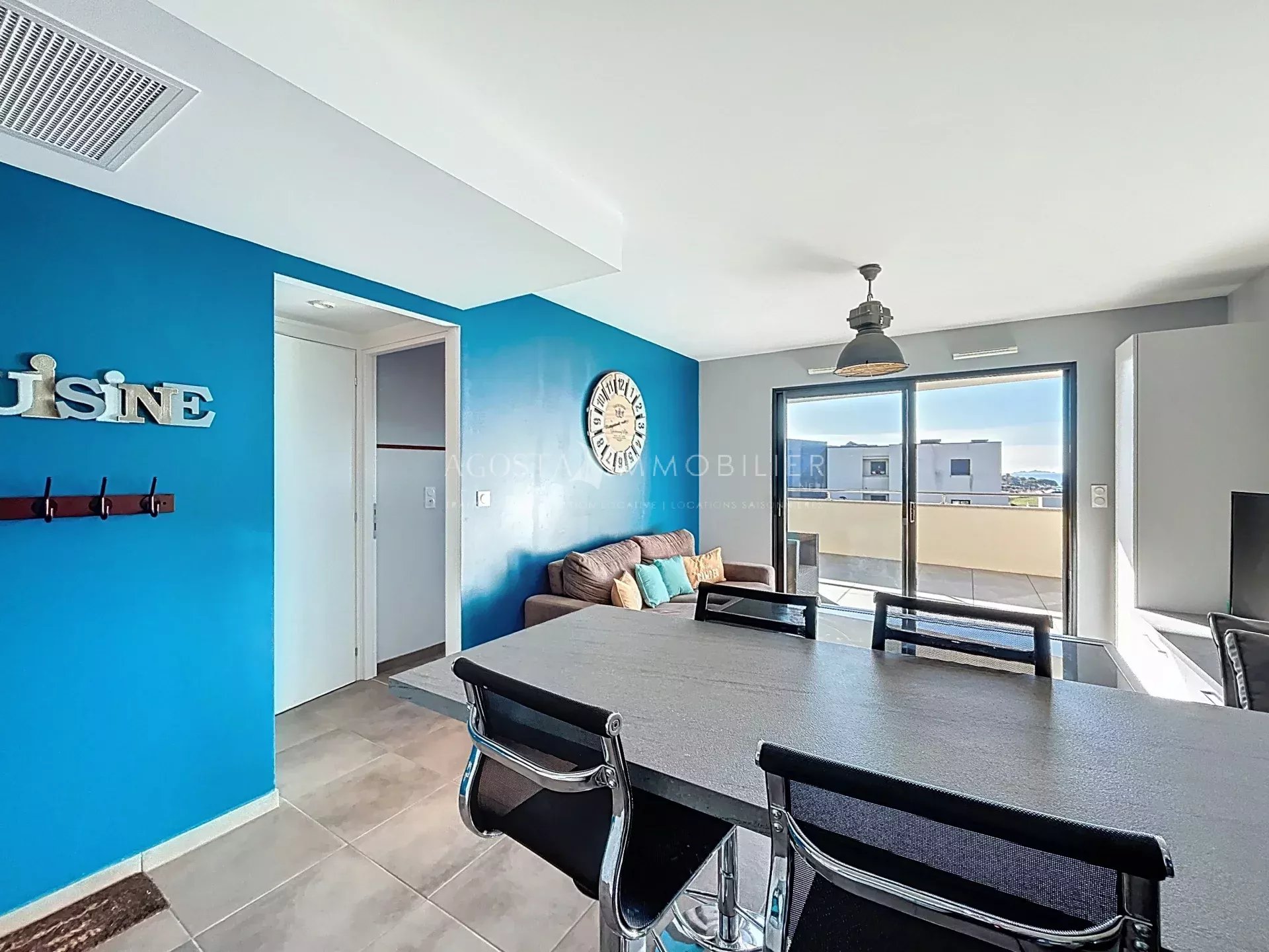 Séjour avec cuisine équipée, une chambre, salle de douche, wc. Le séjour et la chambre ouvrent sur la terrasse, Jolie vue mer sur la baie d'Ajaccio, sur Les Sanguinaires.