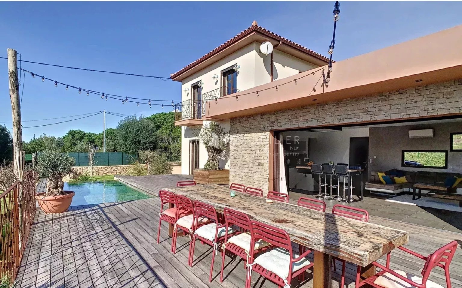 Implantée sur un terrain paysager, la propriété séduit par ses beaux espaces extérieurs, comprenant une vaste terrasse parfaitement exposée et une magnifique piscine à débordement, idéale pour profiter pleinement du cadre et de la luminosité.