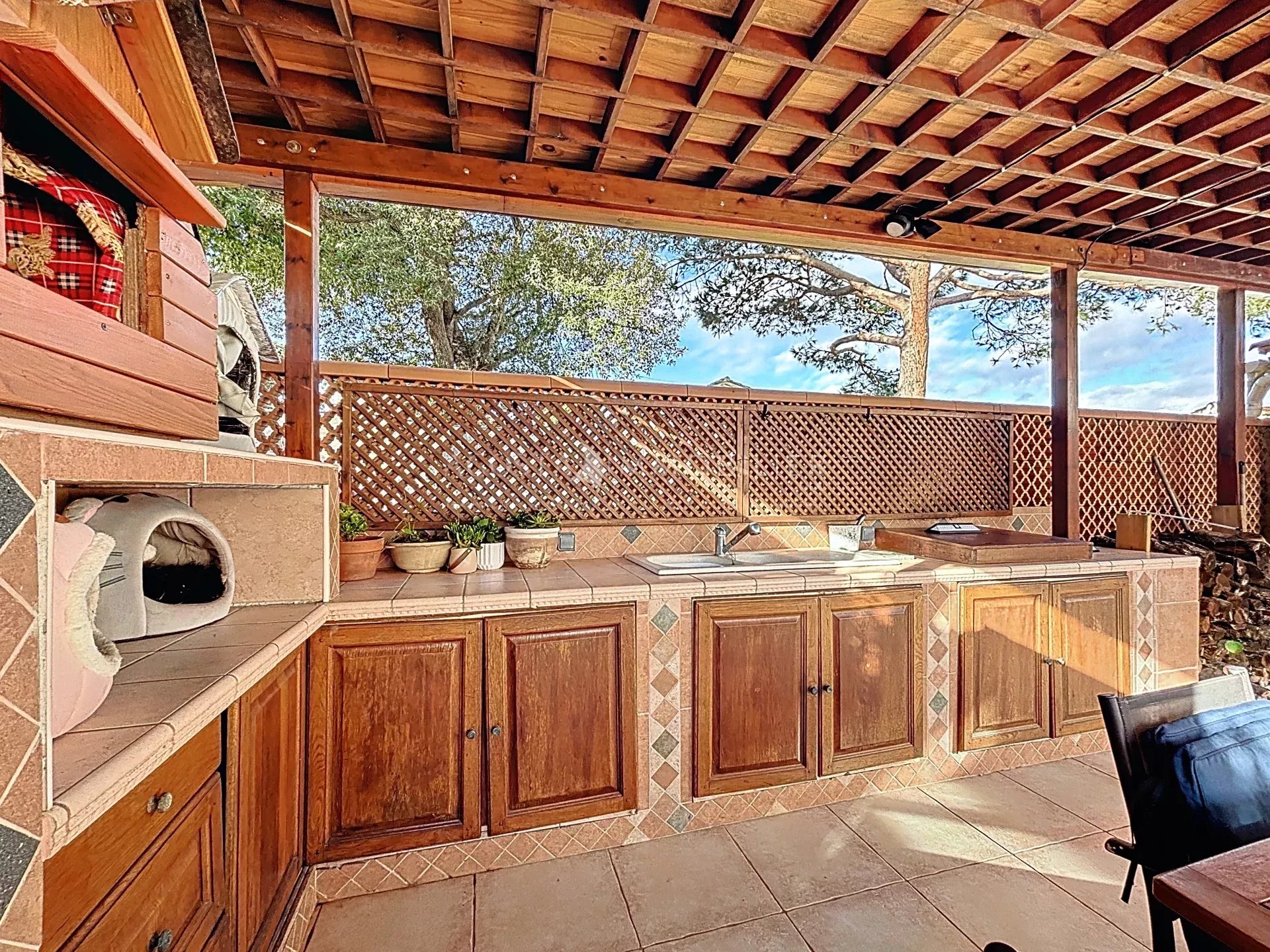 Le jardin, intime et facile à entretenir avec ses 435 m², est agrémenté d’une terrasse avec cuisine d’été, offrant un espace agréable pour profiter pleinement de la double exposition de la villa. Coté pratique, douche d'été pour les retours de plage.