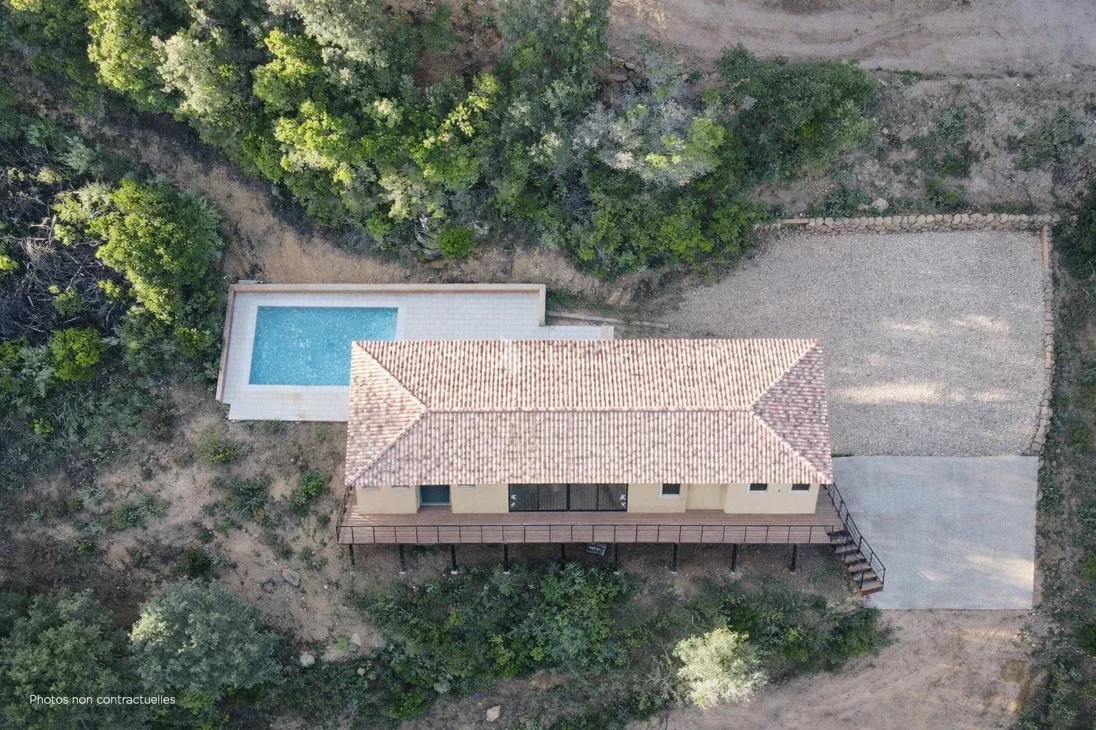 La villa se compose d'un spacieux séjour lumineux, d'une cuisine moderne entièrement équipée, de quatre chambres confortables, d'une salle de bains avec wc et d'un WC indépendant. Elle dispose également d'une terrasse au cœur du maquis, idéale pour se détendre et profiter du calme environnant.